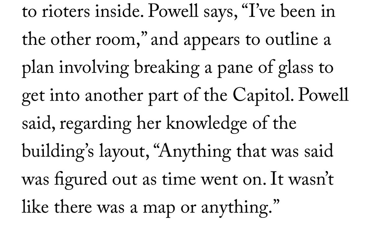 In videos, she is seen accepting the bullhorn from another rioter and using it to issue detailed instructions about the layout of the Capitol. Powell claimed that her knowledge of the floor plan was based on her presence there that day.