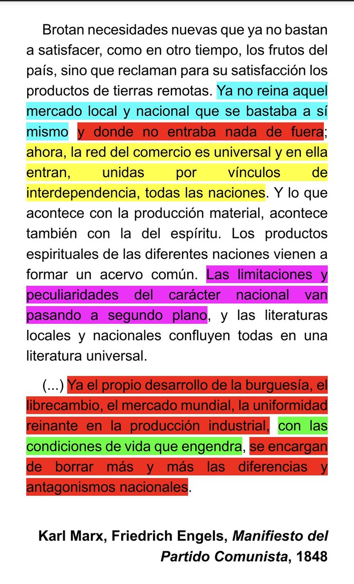 Esta reacción asustadiza de los reaccionarios aristobreros y pequeño burgueses ante la dinámica mundial de un capitalismo que no comprenden y q tiende a erosionar los rasgos y las barreras nacionales ya fue descrita por Marx y Engels todavía en la era del capitalismo ascensional: Image