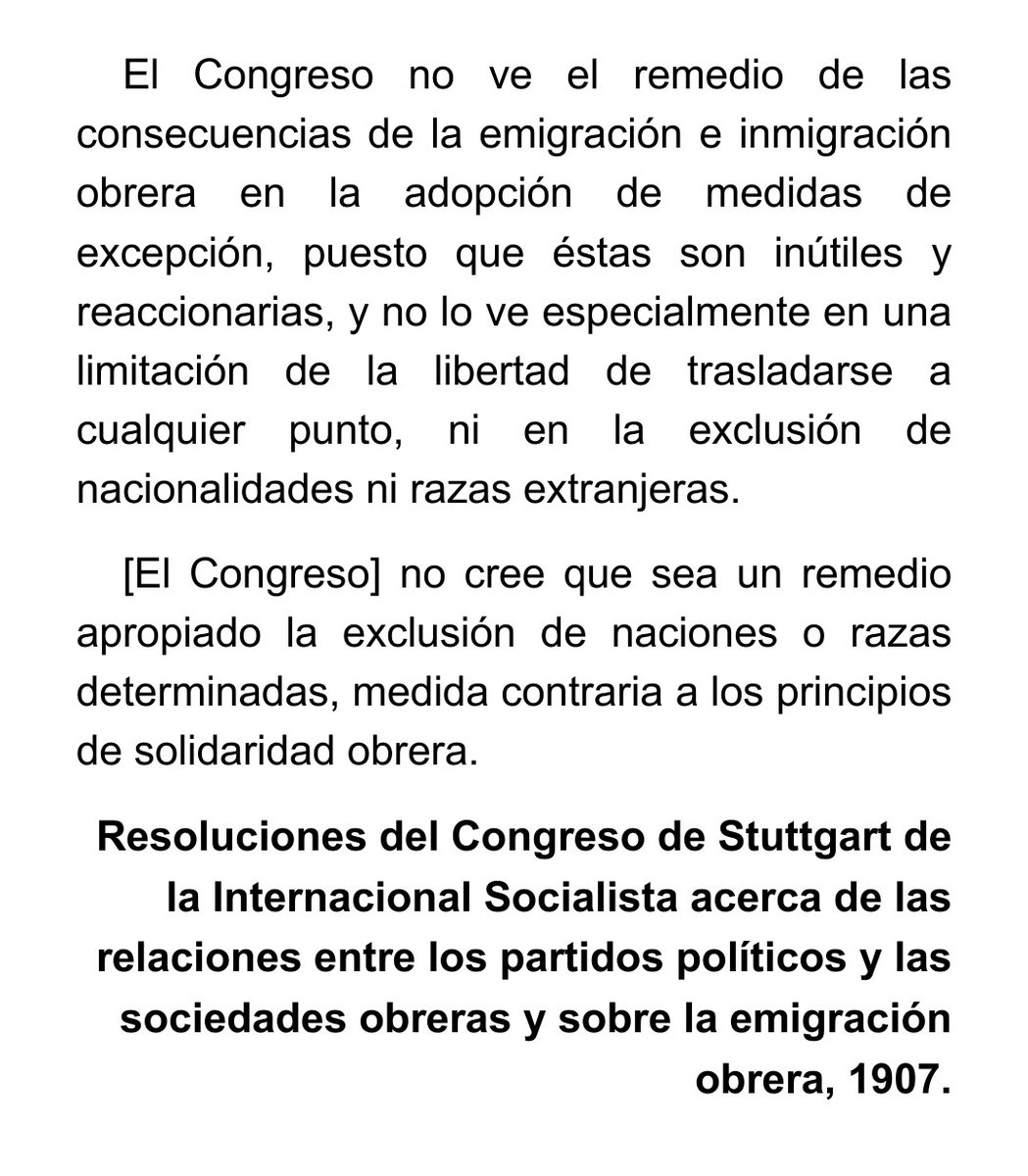La posición más elemental del marxismo ante la inmigración de los obreros ya quedó clara en el Congreso de Stuttgart para sonrojo y lamento de los socialpatriotas pequeño burgueses: Image