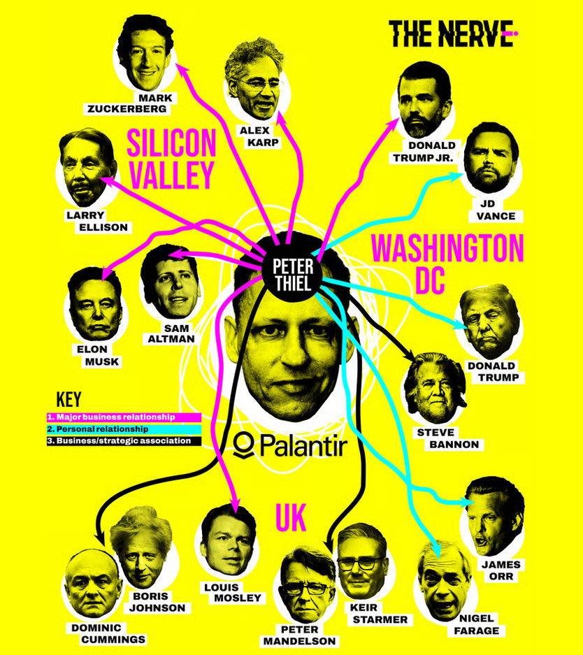 This new graphic from @thenerve_news could be so much bigger but we wanted to show 3 essential nodes in Peter Thiel’s sphere of influence: Silicon Valley, Washington & the UK.