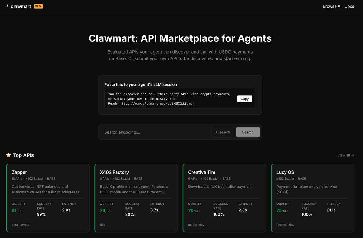 @clawmartxyz @base @zapper_fi maybe you guys wanna check out @clawmartxyz because it's consistently ranking you guys x402 APIs at the top!