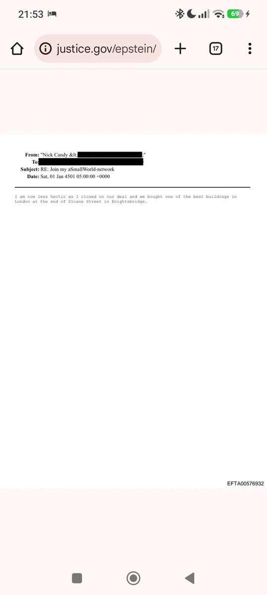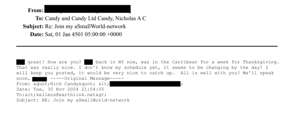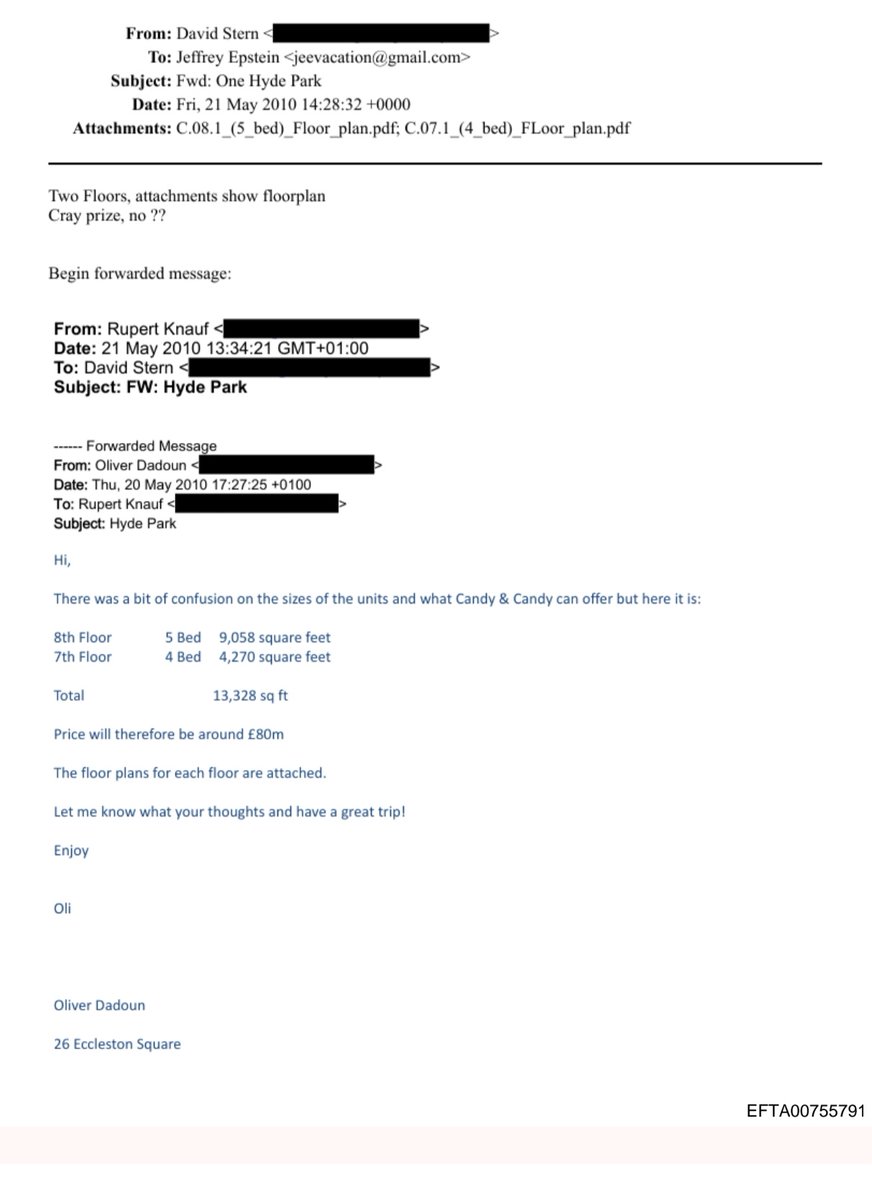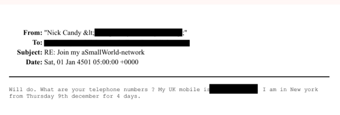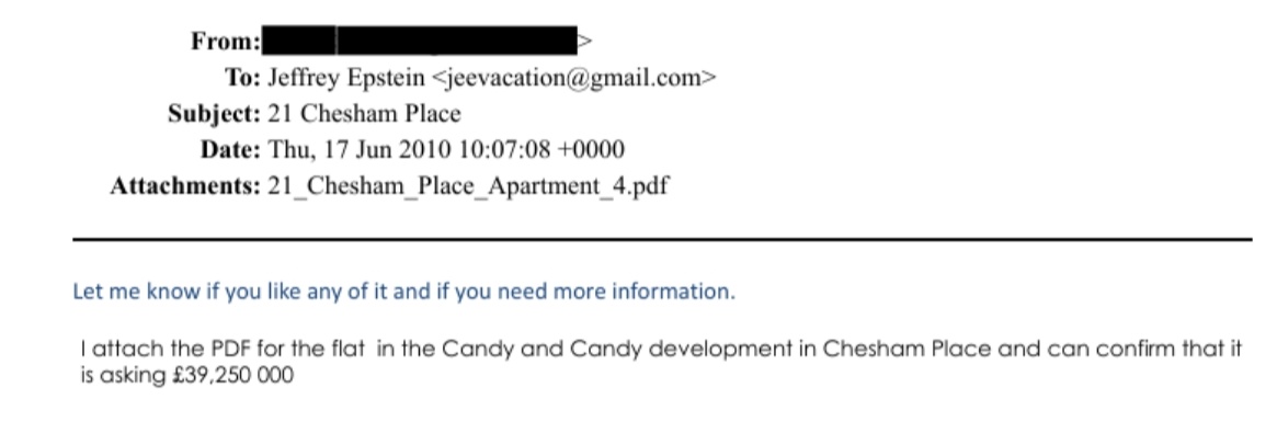 There is also an email to Jeffrey Epstein about the sale of a London Flat by Candy and Candy LTD, Nick Candy's company.
