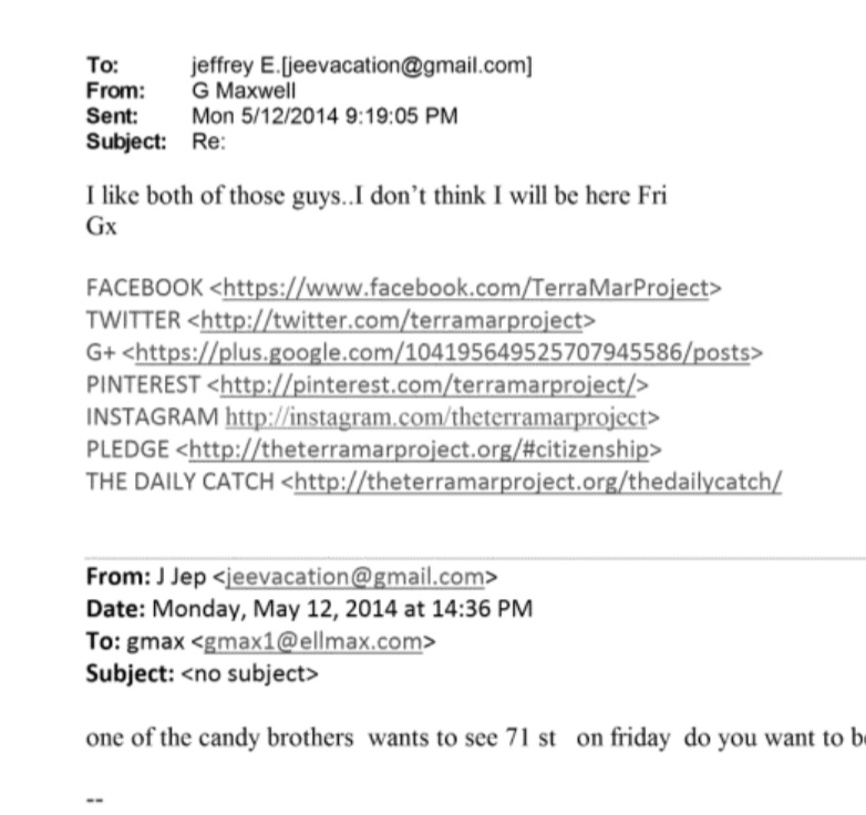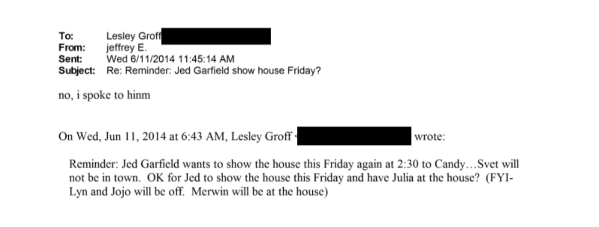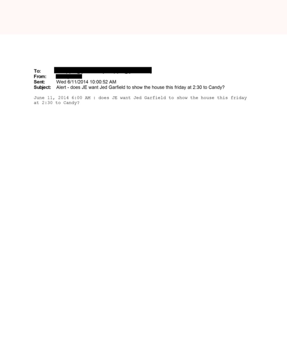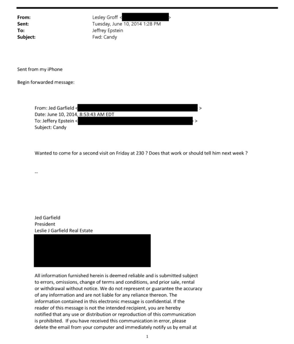 Here it seems 'Candy' is arranging a first, and second visit to a house with the help of Jed Garfield liaising directly with Jeffrey Epstein Image