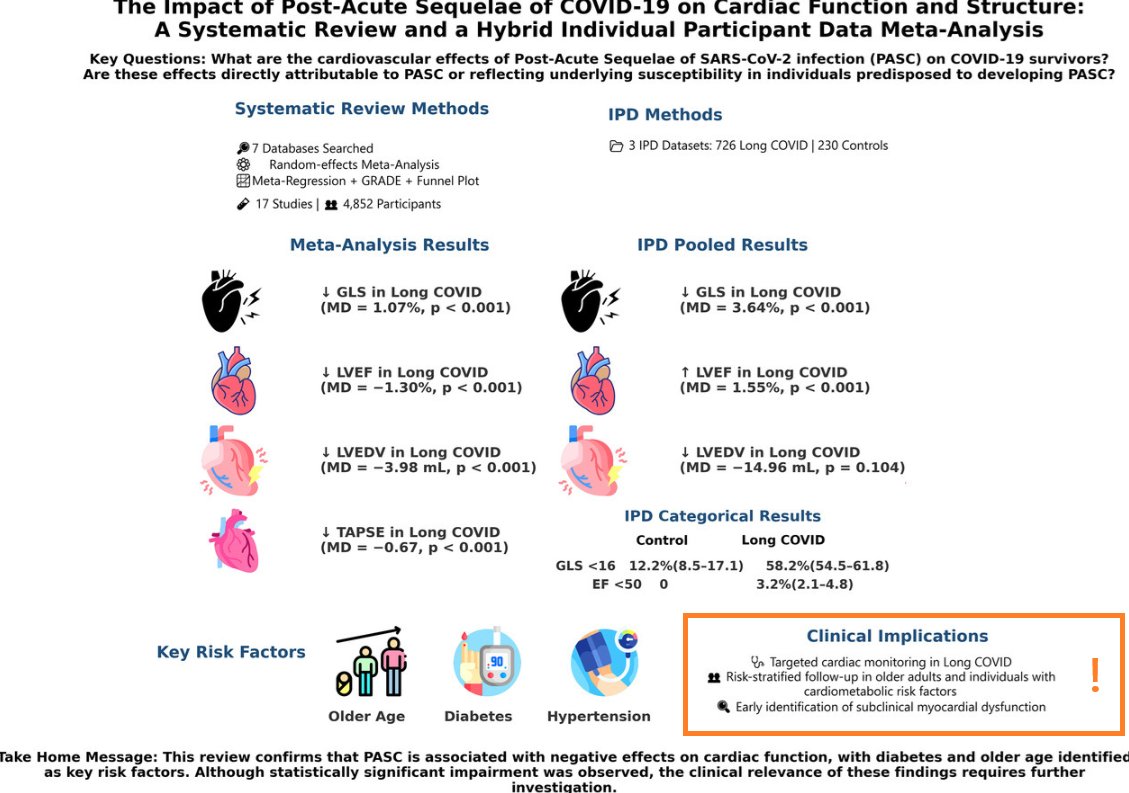 Subtle but consistent subclinical cardiac impairments in PASC, including reduced global longitudinal strain (‼️58% of PASC cases had left ventricular dysfunction), slightly lower left ventricular ejection fraction, and reduced end-diastolic volume.