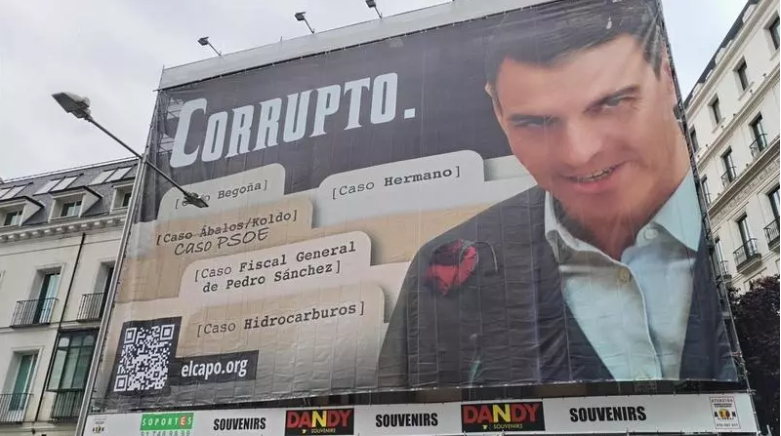 A giant banner hung opposite Spain’s Congress showing Pedro Sánchez’s face with one word: CORRUPTO.
