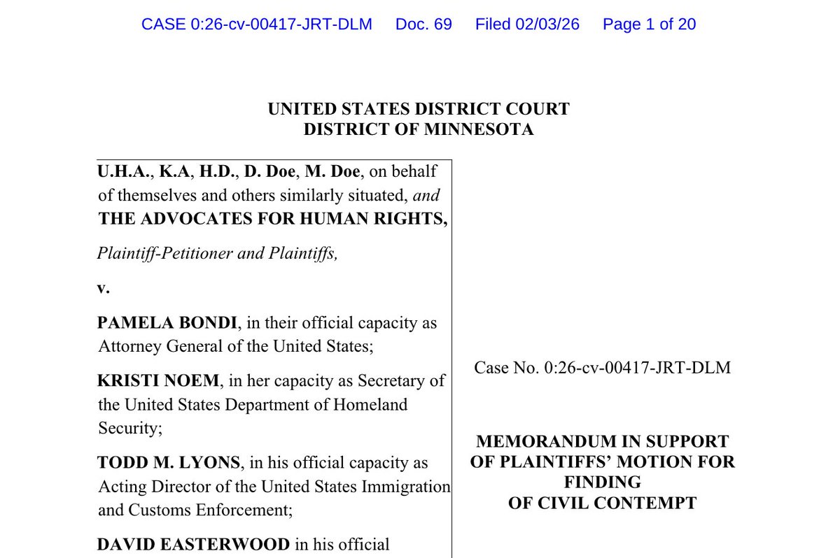 Attys for class of refugees have asked Judge Tunheim in MN to hold govt in civil contempt for alleged failure to comply with his 1/28 order to unconditionally release refugees detained under a new DHS policy that, they say, departs from 45 yrs of practice.