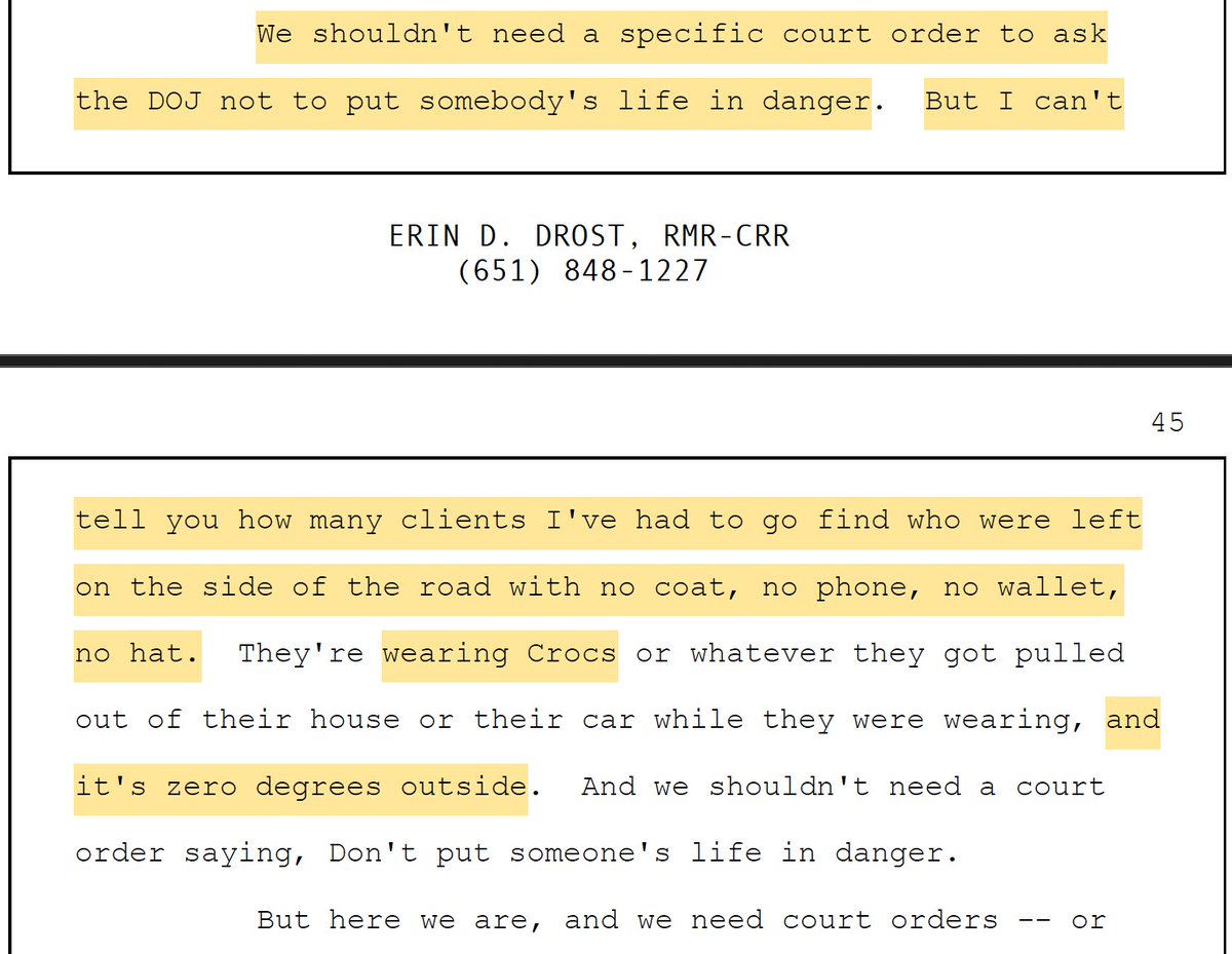 Says one detainee’s lawyer: “We shouldn’t need a specific court order to ask the DOJ not to put someone’s life in danger. ... [I’ve had to pick up clients] who were left on the side of the road with no coat, no phone, no wallet, no hat ... and it’s zero degrees outside.”