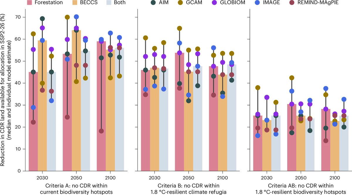 The authors test this, and find that over 50% (median) of land allocated for forestation and BECCS would be unavailable by 2050 if current biodiversity hotspots were excluded.