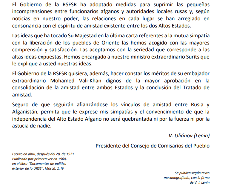 un digno combatiente contra el yugo colonial, una nación progresista –aunque fuera un emirato–. Ambos países firmaron el Tratado de Amistad Afgano-Soviético en 1921.