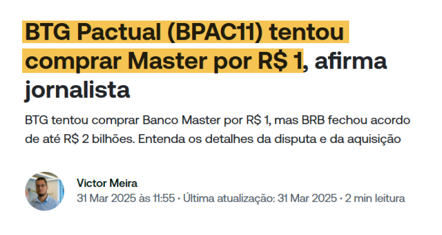O objetivo era apenas um valor simbólico, em que o BTG passaria a assumir a dívida e o controle do Master. Vorcaro recusou e vendeu ao BRB.