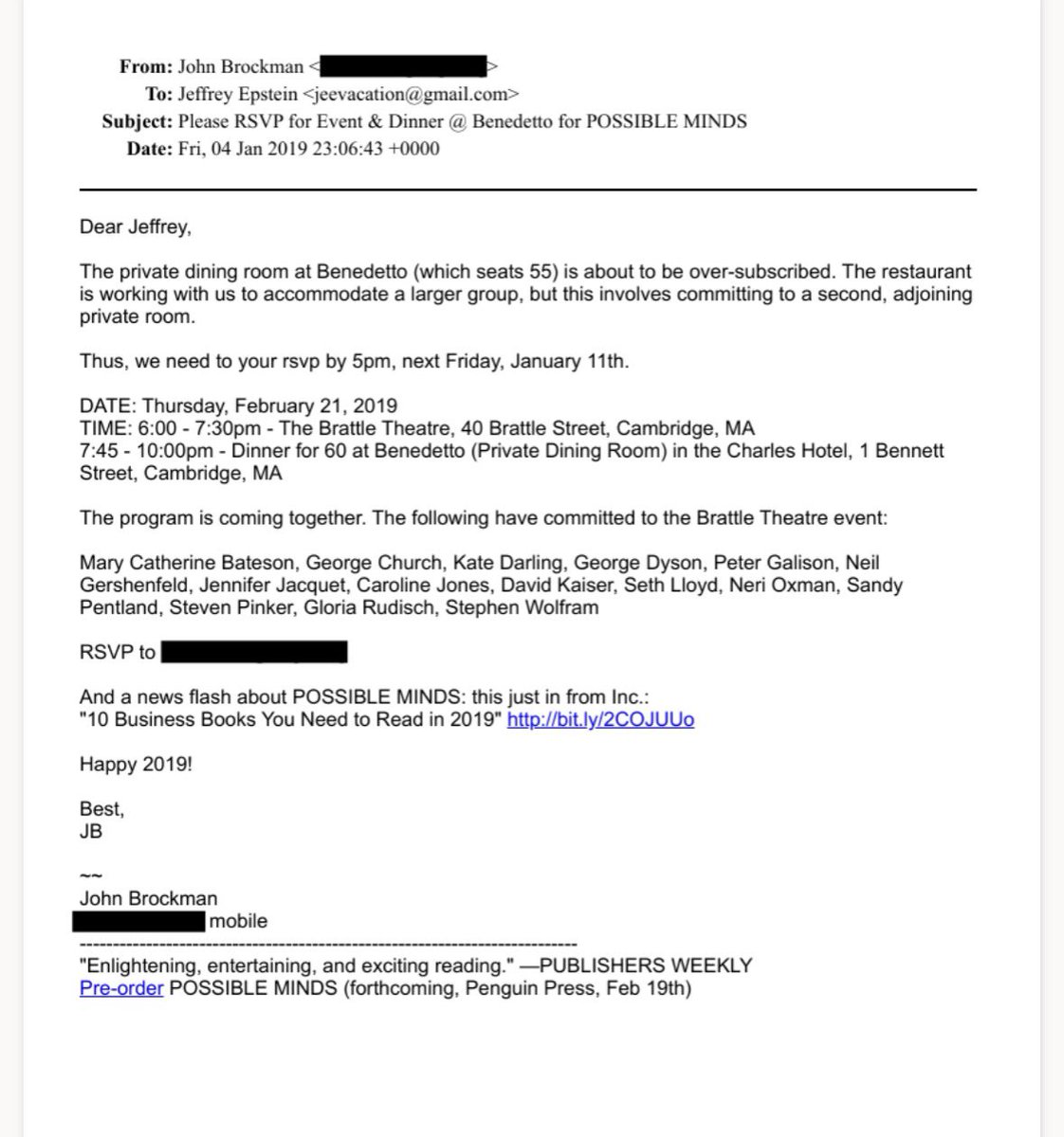 Communications and events part 4. (See the Bill Gates email “here with Pinker. Great Fun.)