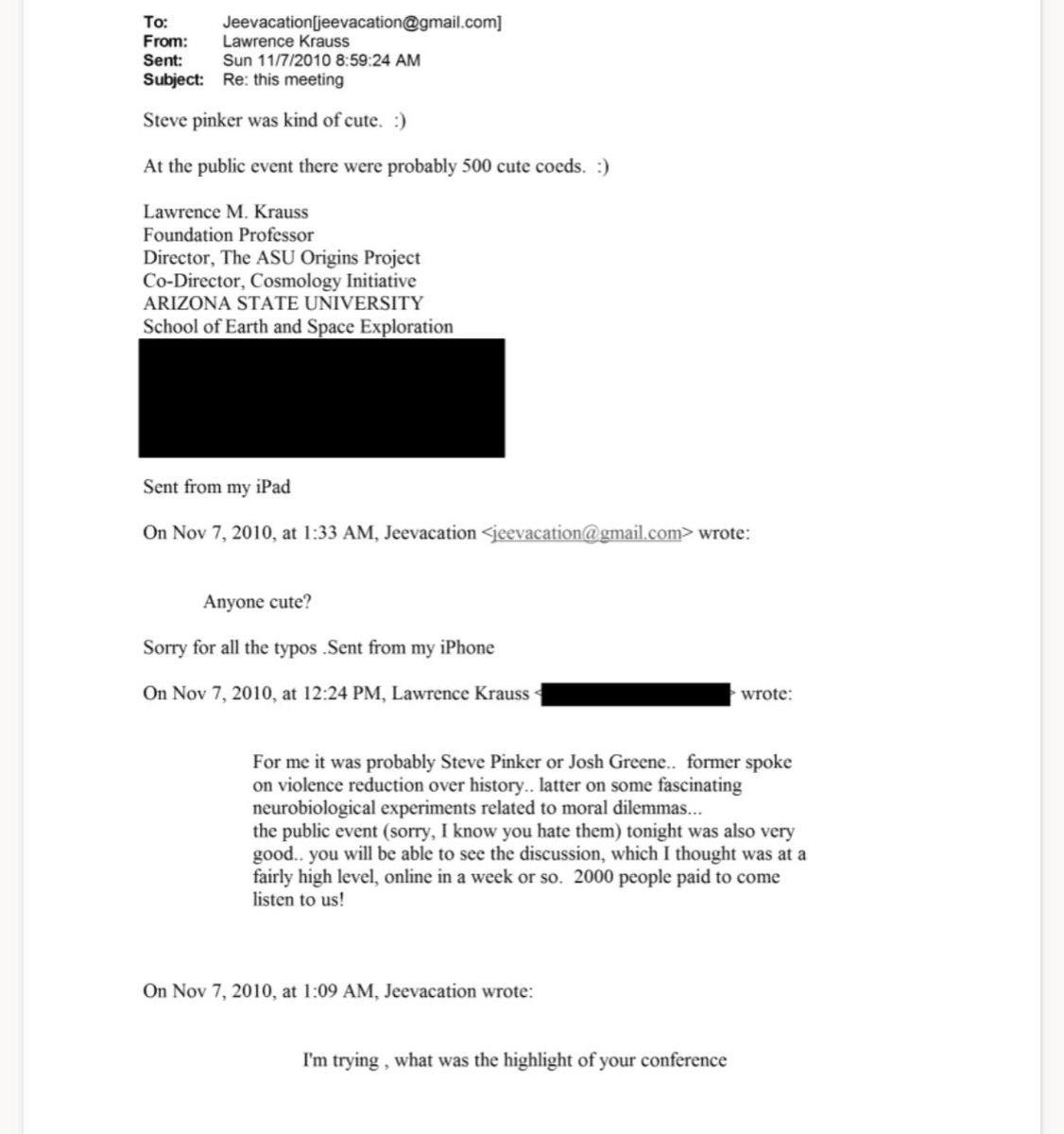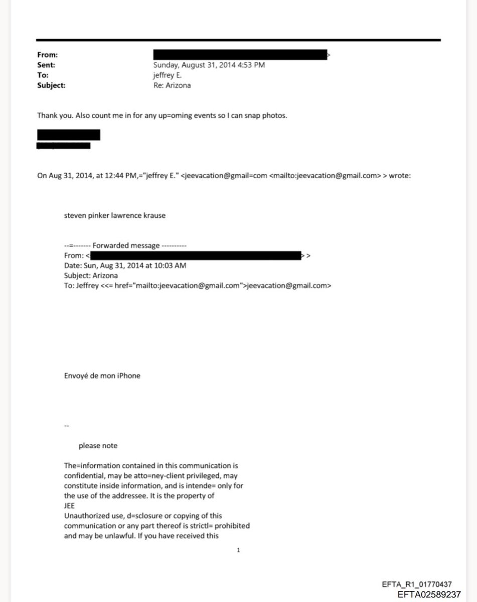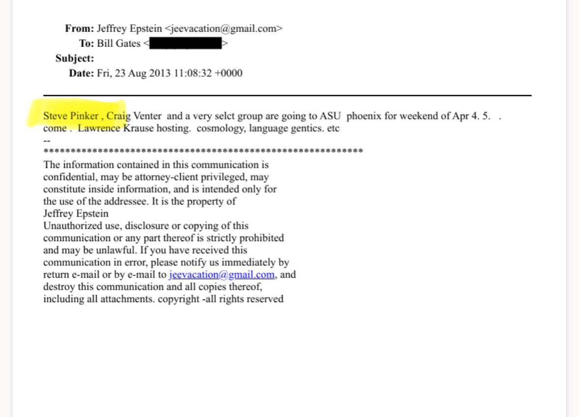 Side note: Lawrence Krauss, who helped organize and attend Epstein-funded scientific conferences and publicly came to Epstein’s defense, apparently thought Pinker was “cute.”