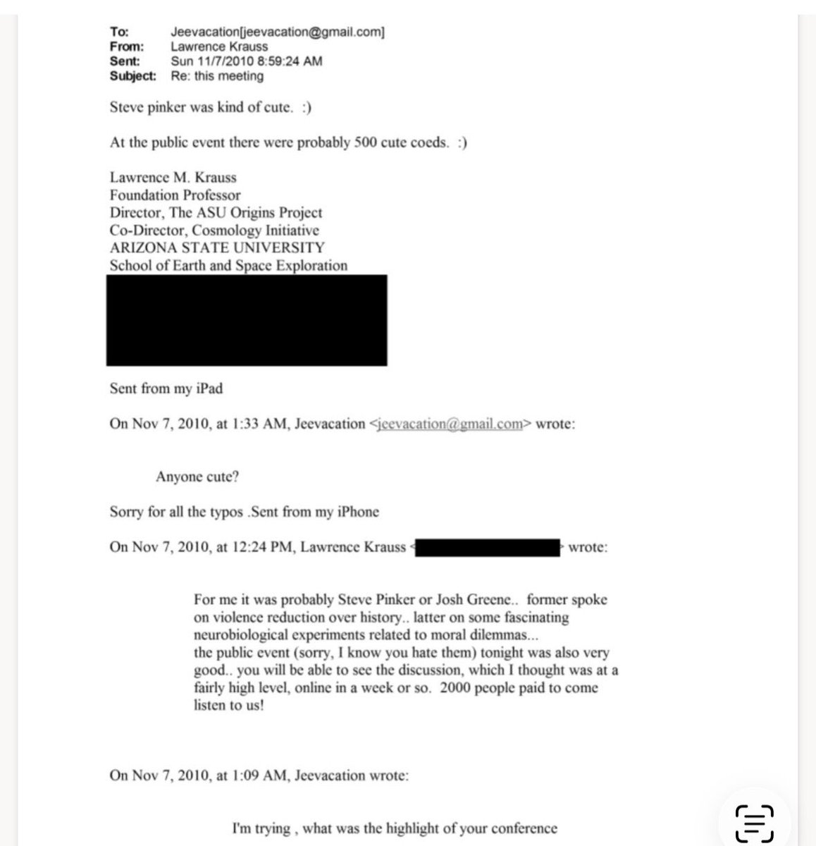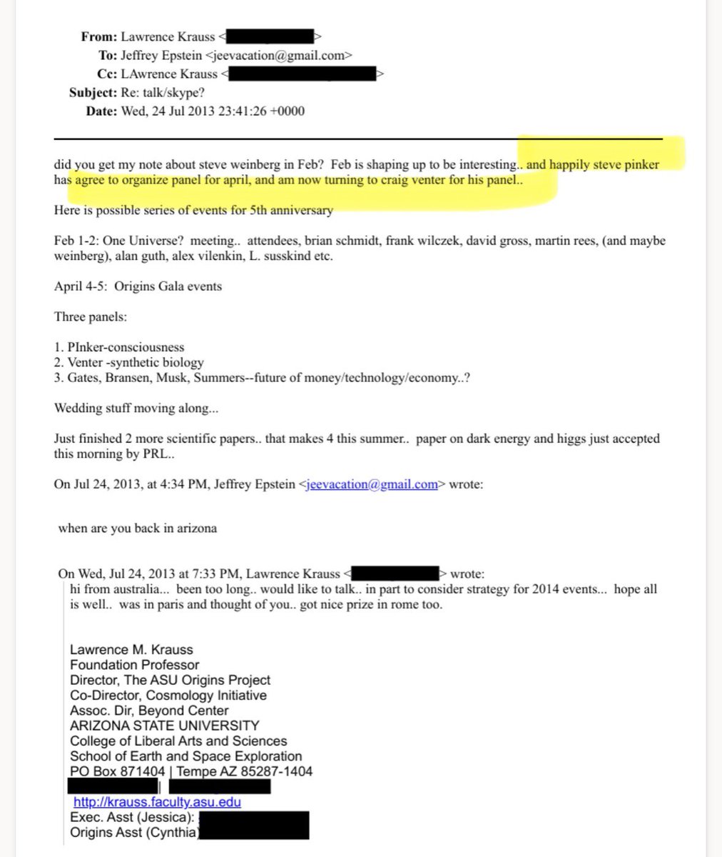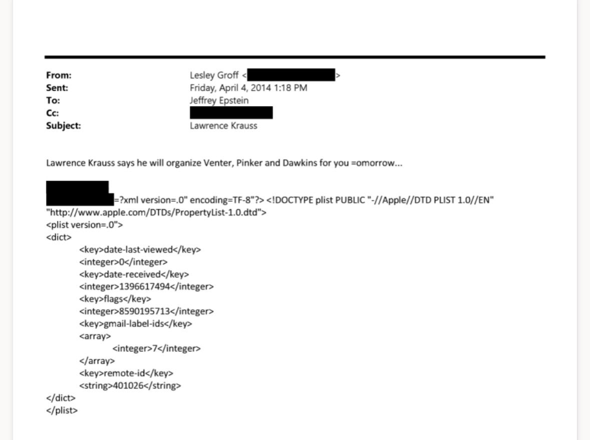 Side note: Lawrence Krauss, who helped organize and attend Epstein-funded scientific conferences and publicly came to Epstein’s defense, apparently thought Pinker was “cute.”