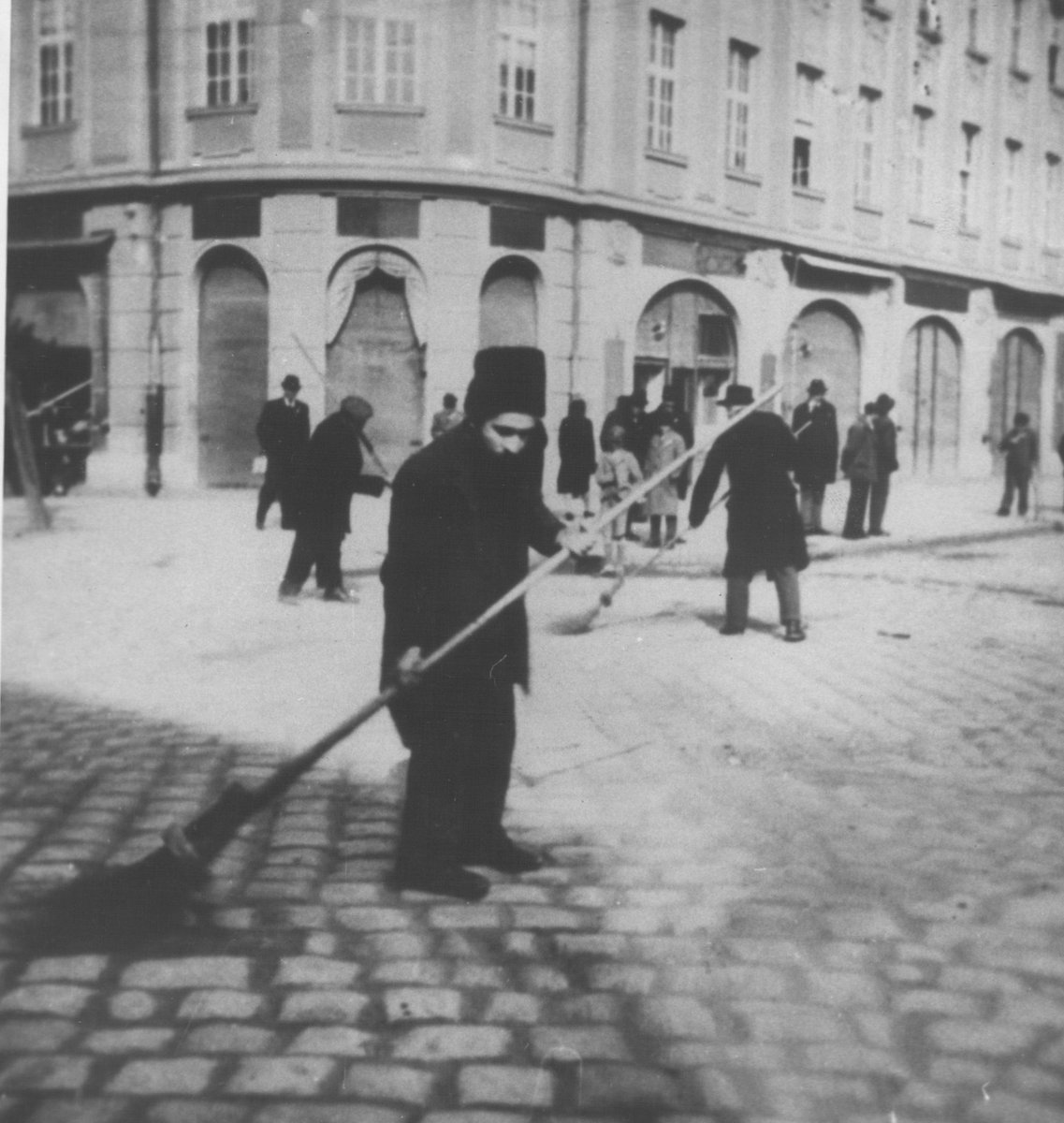 Jews being used as forced labour to clean streets, Senta, Serbia (1941-1944 under special administration by local German population). Roughly May 1941.