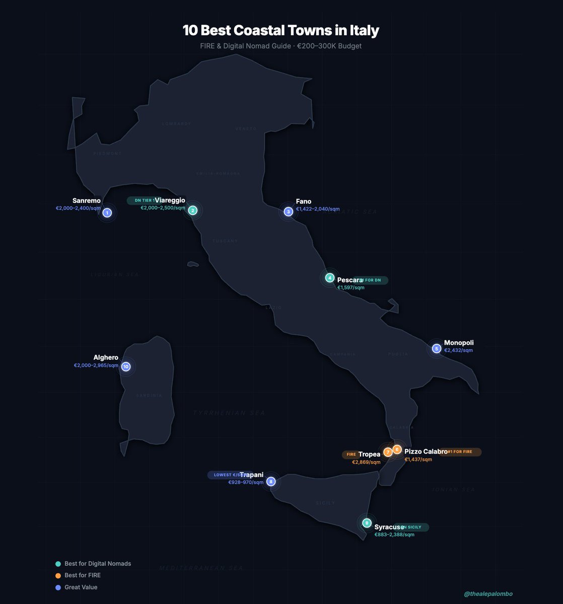 10 towns. The definitive guide for FIRE and Digital Nomads in Italy.