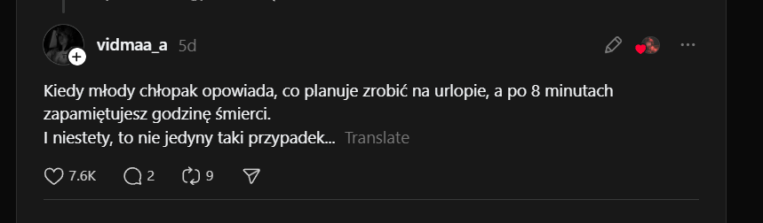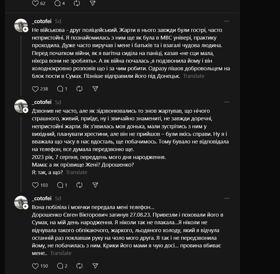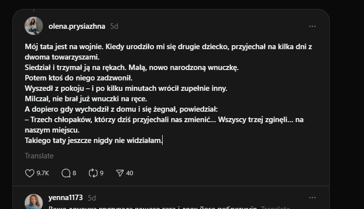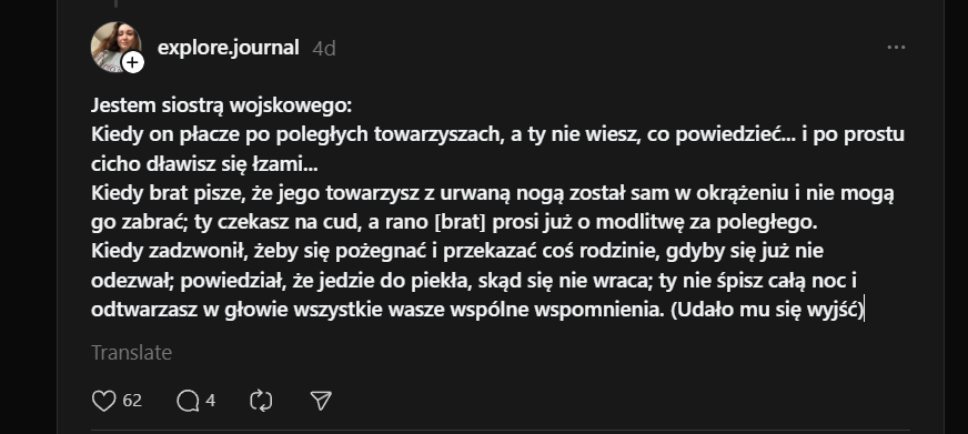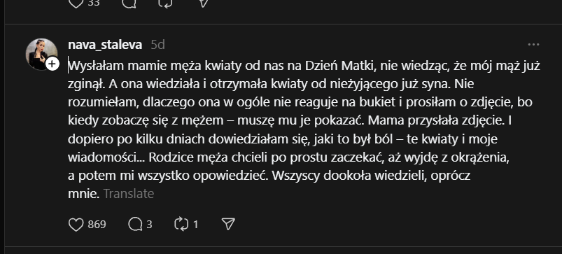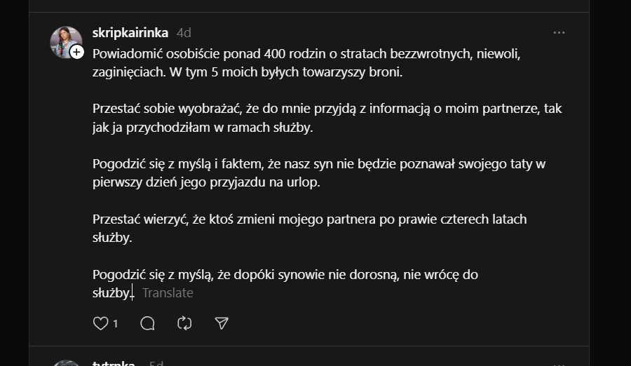 Nie [jestem] wojskową, [jestem] byłą żoną. Kiedy zawiadomienie przychodzi do mnie, bo jego krewni mają to w dupie. Kiedy na policji z dzieckiem składasz dokumenty, oddajesz DNA, a jego brat nie przyjeżdża, bo jeszcze złapie go TCK. Za każdym razem serce pęka, gdy 6-letnia córka pyta, dlaczego Ruscy zrujnowali życie jej taty, a ja patrzę w te oczy, ledwo powstrzymuję łzy, bo nie wiem, co odpowiedzieć... kiedy w histerii krzyczy, że tata umarł – ona [to] wie. Dziękuję każdemu żołnierzowi i żołnierce, dzięki Wam istniejemyImage