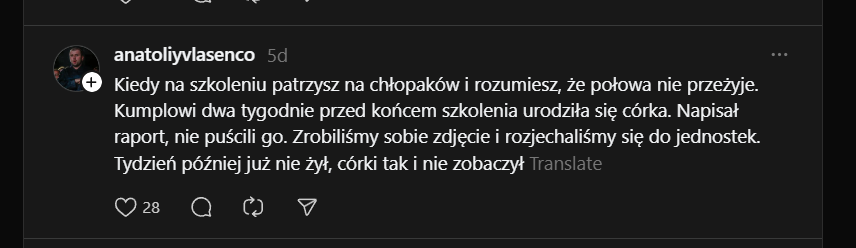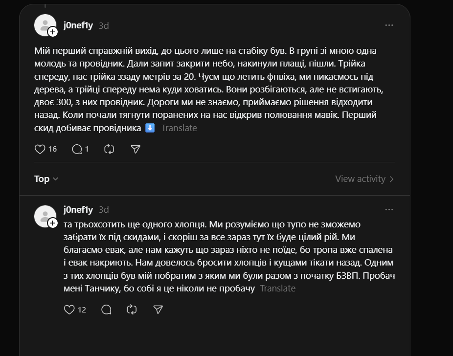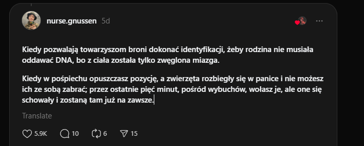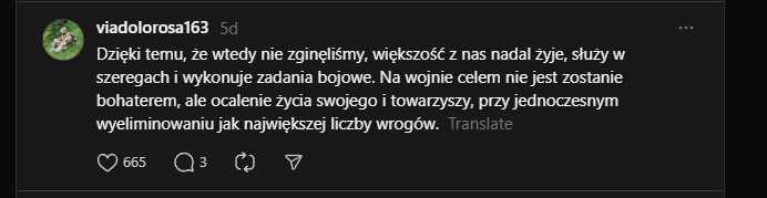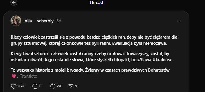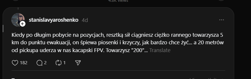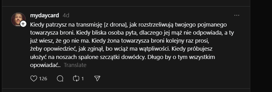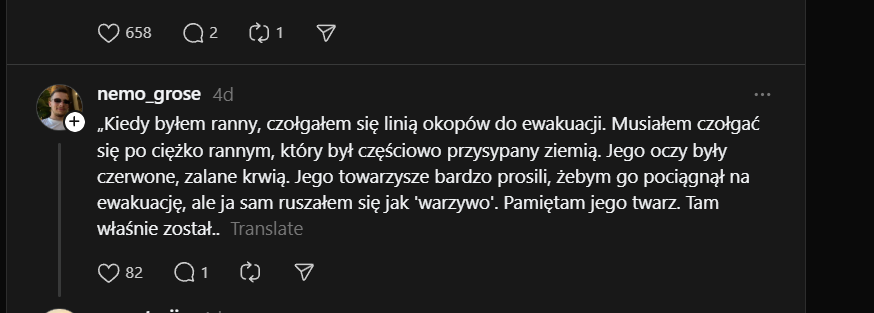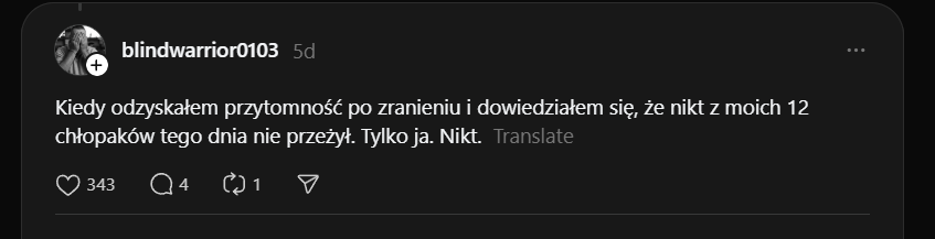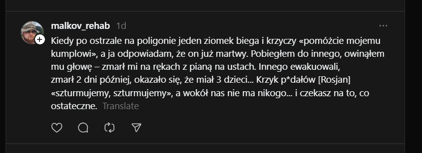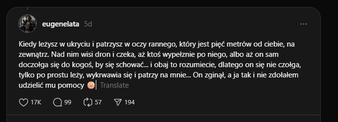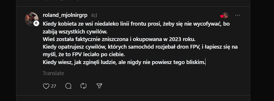 "Kiedy leżysz w ukryciu i patrzysz w oczy rannego, który jest pięć metrów od ciebie, na zewnątrz. Nad nim wisi dron i czeka, aż ktoś wypełznie po niego, albo aż on sam doczołga się do kogoś, by się schować... i obaj to rozumiecie, dlatego on się nie czołga, tylko po prostu leży, wykrwawia się i patrzy na mnie... On zginął, a ja tak i nie zdołałem udzielić mu pomocy 🫥"Image