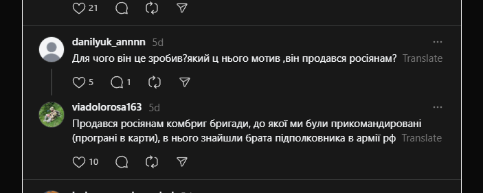 Mój brat zginął, kiedy był w wojskowym samochodzie, zamknięty na pace [w przedziale ładunkowym]. Jechali na zadanie, by ratować innych. Najpierw wylecieli na minie, potem trafił w nich pocisk od p*dałów [Rosjan], i to wszystko dałoby się przeżyć, gdyby nie sprzęt, który był w środku z bratem i wybuchł. To już był koniec. 2 minuty zdarzeń i nie ma pięciu ludzi 😞. Szczątków zostało 30 kg z 5 osób… Do tej pory nie ma wyników DNA. 😔 Śledczy ignoruje sprawę. Moje wyrazy współczucia dla każdego, kto kogoś stracił.Image