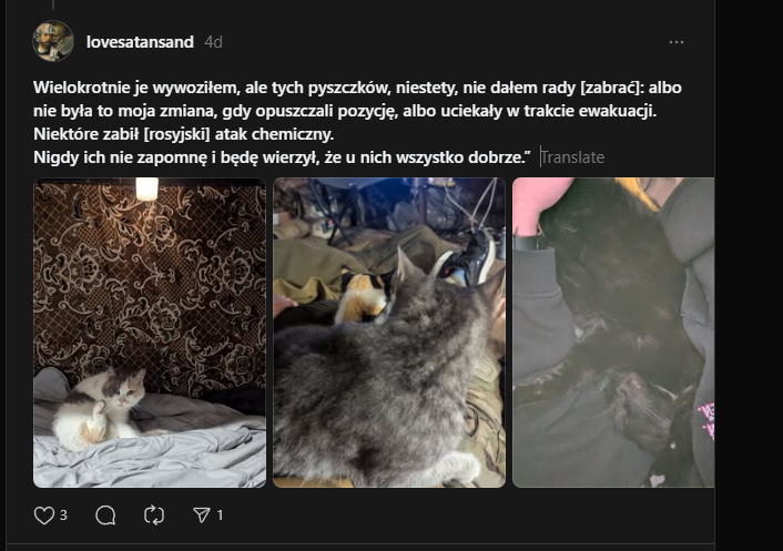 Wielokrotnie je wywoziłem, ale tych pyszczków, niestety, nie dałem rady [zabrać]: albo nie była to moja zmiana, gdy opuszczali pozycję, albo uciekały w trakcie ewakuacji. Niektóre zabił [rosyjski] atak chemiczny. Nigdy ich nie zapomnę i będę wierzył, że u nich wszystko dobrze. Image