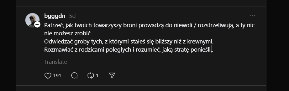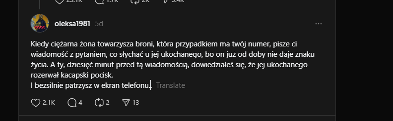 "Kiedy ciężarna żona towarzysza broni, która przypadkiem ma twój numer, pisze ci wiadomość z pytaniem, co słychać u jej ukochanego, bo on już od doby nie daje znaku życia. A ty, dziesięć minut przed tą wiadomością, dowiedziałeś się, że jej ukochanego rozerwał kacapski pocisk. I bezsilnie patrzysz w ekran telefonu.."Image