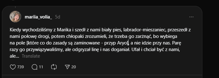 Kiedy wychodziliśmy z Marika i szedł z nami biały pies, labrador-mieszaniec, przeszedł z nami połowę drogi, potem chłopaki zrozumieli, że trzeba go zarżnąć, bo wybiega na pole [które co do zasady są zaminowane - przyp Aryo], a nie idzie przy nas. Parę razy go przywiązywaliśmy, ale odgryzał linę i nas doganiał. Ufał i chciał być z nami, ale…Image