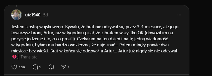 Jestem siostrą wojskowego. Bywało, że brat nie odzywał się przez 3-4 miesiące, ale jego towarzysz broni, Artur, raz w tygodniu pisał, że z bratem wszystko OK (dowoził im na pozycje jedzenie i to, o co prosili). Czekałam na ten dzień i na tę jedną wiadomość w tygodniu, byłam mu bardzo wdzięczna, że daje znać… Potem minęły prawie dwa miesiące bez wieści. Brat w końcu się odezwał, a Artur… Artur już nigdy się nie odezwał 💔.Image