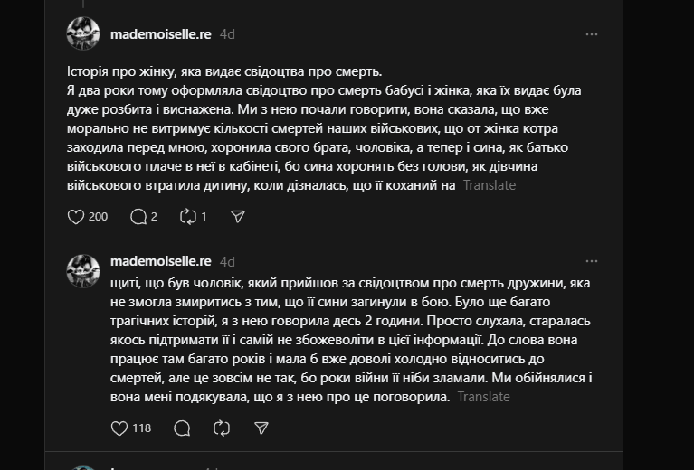 Akty zgonu "Historia o kobiecie, która wydaje akty zgonu. Dwa lata temu załatwiałam akt zgonu babci i kobieta, która je wydaje, była bardzo rozbita i wyczerpana. Zaczęłyśmy rozmawiać, powiedziała, że psychicznie nie wytrzymuje już liczby śmierci naszych wojskowych. Że kobieta, która weszła przede mną, chowała swojego brata, męża, a teraz i syna; jak ojciec wojskowego płacze u niej w gabinecie, bo syna chowają bez głowy; jak dziewczyna wojskowego straciła dziecko, gdy dowiedziała się, że jej ukochany jest na tarczy; że był mężczyzna, który przyszedł po akt zgonu żony, która nie mogła pogodzić się z tym, że jej synowie zginęli w walce. Było jeszcze wiele tragicznych historii, rozmawiałam z nią gdzieś z 2 godziny. Po prostu słuchałam, starałam się ją jakoś wesprzeć i samej nie zwariować od tych informacji. Dodam, że ona pracuje tam wiele lat i powinna już dość chłodno podchodzić do śmierci, ale tak wcale nie jest, bo lata wojny jakby ją złamały. Przytuliłyśmy się i podziękowała mi, że z nią o tym porozmawiałam."Image
