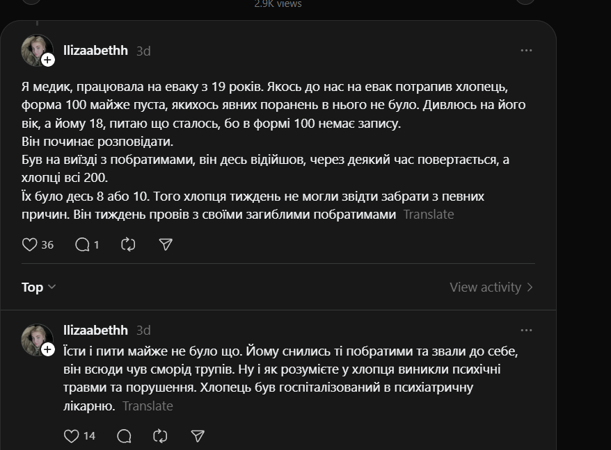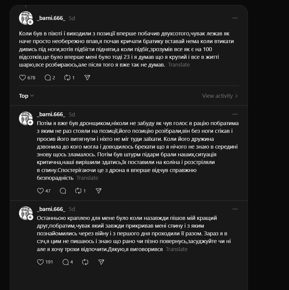 Kiedy po ostrzale na poligonie jeden ziomek biega i krzyczy «pomóżcie mojemu kumplowi», a ja odpowiadam, że on już martwy. Pobiegłem do innego, owinąłem mu głowę – zmarł mi na rękach z pianą na ustach. Innego ewakuowali, zmarł 2 dni później, okazało się, że miał 3 dzieci... Krzyk p*dałów [Rosjan] «szturmujemy, szturmujemy», a wokół nas nie ma nikogo... i czekasz na to, co ostateczneImage