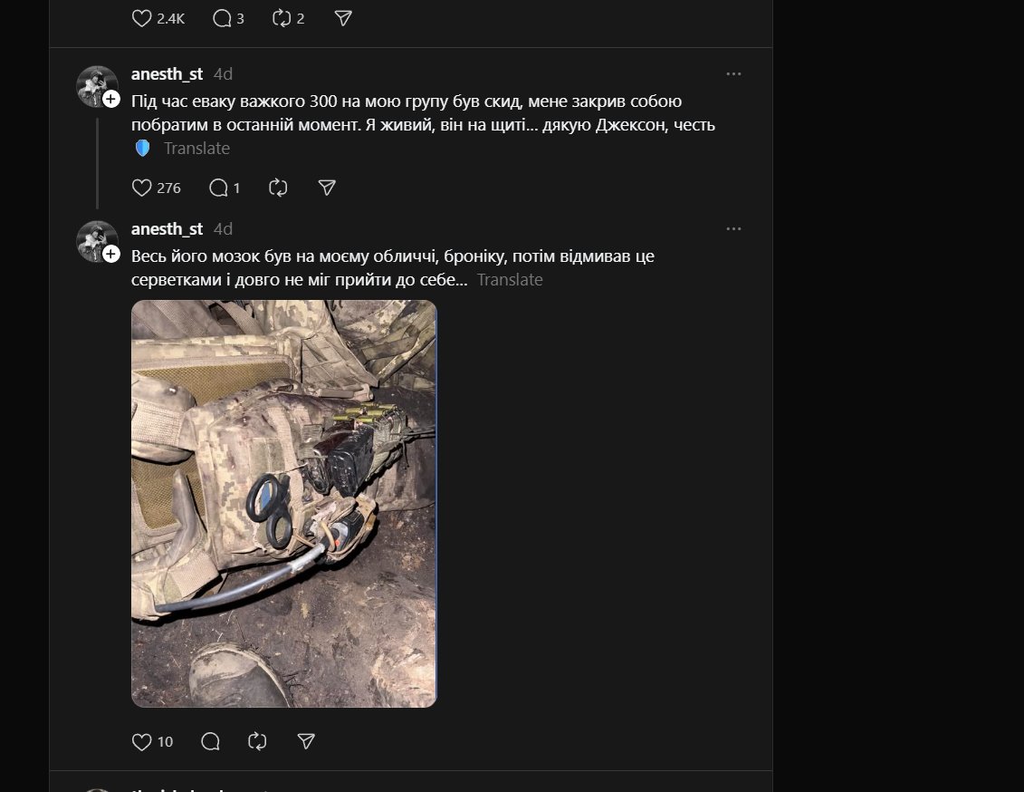 Podczas ewakuacji ciężkiego »trzechsetnego« na moją grupę spadł zrzut [z drona]. W ostatniej chwili własnym ciałem zasłonił mnie towarzysz. Ja żyję, on jest na tarczy… dzięki Jackson, cześć [twojej pamięci]. Cały jego mózg miałem na twarzy, na kamizelce, potem zmywałem to chusteczkami i długo nie mogłem dojść do siebie…Image