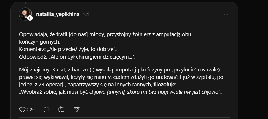 Mój znajomy, 35 lat, z bardzo (!) wysoką amputacją kończyny po „przylocie” (ostrzale), prawie się wykrwawił, liczyły się minuty, cudem zdążyli go uratować. I już w szpitalu, po jednej z 24 operacji, napatrzywszy się na innych rannych, filozofuje: „Wyobraź sobie, jak musi być chujowo [innym], skoro mi bez nogi wcale nie jest chujowo”."Image