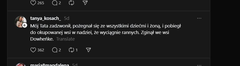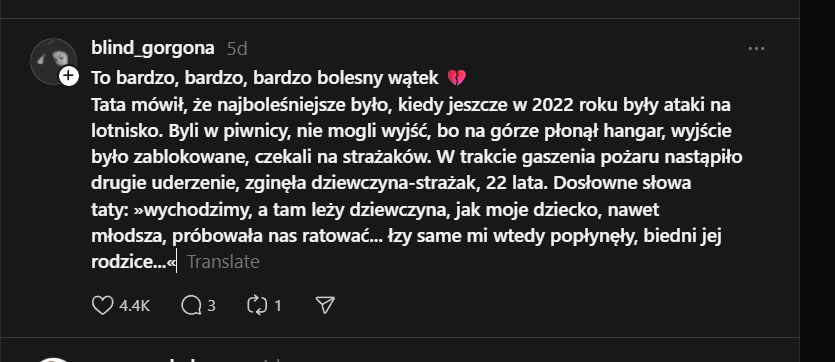 To bardzo, bardzo, bardzo bolesny wątek 💔 Tata mówił, że najboleśniejsze było, kiedy jeszcze w 2022 roku były ataki na lotnisko. Byli w piwnicy, nie mogli wyjść, bo na górze płonął hangar, wyjście było zablokowane, czekali na strażaków. W trakcie gaszenia pożaru nastąpiło drugie uderzenie, zginęła dziewczyna-strażak, 22 lata. Dosłowne słowa taty: »wychodzimy, a tam leży dziewczyna, jak moje dziecko, nawet młodsza, próbowała nas ratować... łzy same mi wtedy popłynęły, biedni jej rodzice...«Image