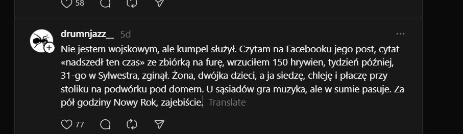 Nie jestem wojskowym, ale kumpel służył. Czytam na Facebooku jego post, cytat «nadszedł ten czas» ze zbiórką na furę, wrzuciłem 150 hrywien, tydzień później, 31-go w Sylwestra, zginął. Żona, dwójka dzieci, a ja siedzę, chleję i płaczę przy stoliku na podwórku pod domem. U sąsiadów gra muzyka, ale w sumie pasuje. Za pół godziny Nowy Rok, zajebiście.”Image