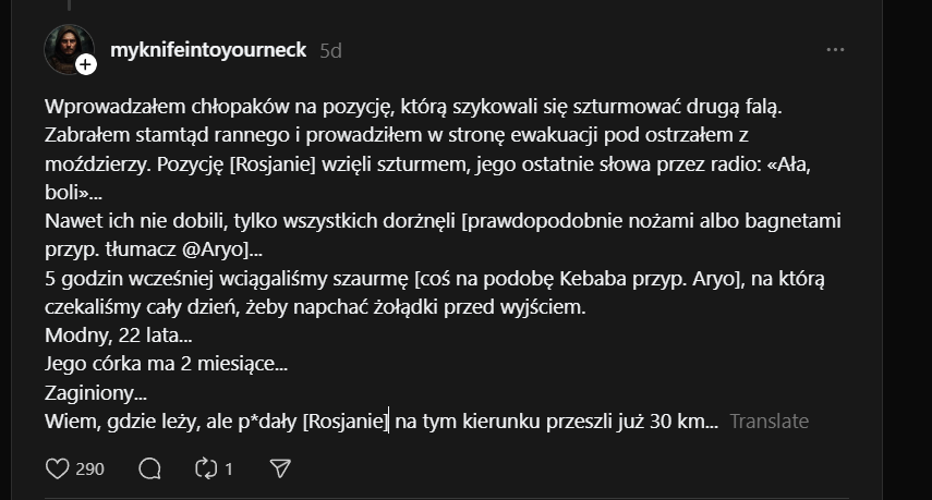 Wprowadzałem chłopaków na pozycję, którą szykowali się szturmować drugą falą. Zabrałem stamtąd rannego i prowadziłem w stronę ewakuacji pod ostrzałem z moździerzy. Pozycję [Rosjanie] wzięli szturmem, jego ostatnie słowa przez radio: «Ała, boli»... Nawet ich nie dobili, tylko wszystkich dorżnęli [prawdopodobnie nożami albo bagnetami przyp. tłumacz Aryo]... 5 godzin wcześniej wciągaliśmy szaurmę [coś na podobę Kebaba przyp. Aryo], na którą czekaliśmy cały dzień, żeby napchać żołądki przed wyjściem. Modny, 22 lata... Jego córka ma 2 miesiące... Zaginiony... Wiem, gdzie leży, ale p*dały [Rosjanie] na tym kierunku przeszli już 30 km...Image
