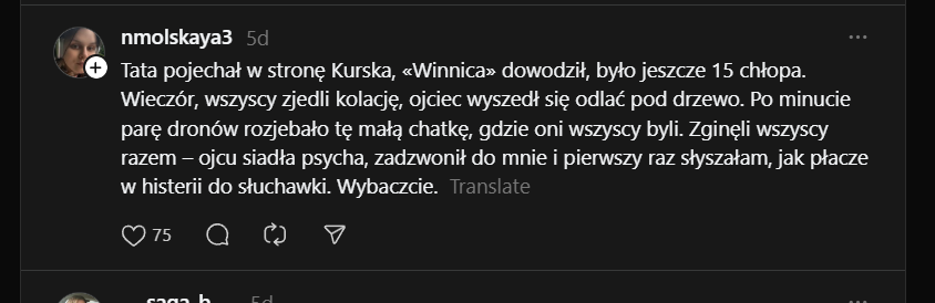 Tata pojechał w stronę Kurska, «Winnica» dowodził, było jeszcze 15 chłopa. Wieczór, wszyscy zjedli kolację, ojciec wyszedł się odlać pod drzewo. Po minucie parę dronów rozjebało tę małą chatkę, gdzie oni wszyscy byli. Zginęli wszyscy razem – ojcu siadła psycha, zadzwonił do mnie i pierwszy raz słyszałam, jak płacze w histerii do słuchawki. Wybaczcie.Image