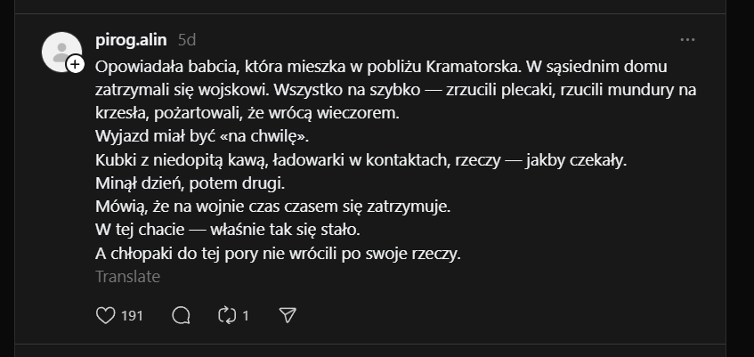 "Opowiadała babcia, która mieszka w pobliżu Kramatorska. W sąsiednim domu zatrzymali się wojskowi. Wszystko na szybko — zrzucili plecaki, rzucili mundury na krzesła, pożartowali, że wrócą wieczorem. Wyjazd miał być «na chwilę». Kubki z niedopitą kawą, ładowarki w kontaktach, rzeczy — jakby czekały. Minął dzień, potem drugi. Mówią, że na wojnie czas czasem się zatrzymuje. W tej chacie — właśnie tak się stało. A chłopaki do tej pory nie wrócili po swoje rzeczy."Image
