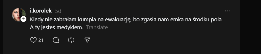 "Kiedy nie zabrałam kumpla na ewakuację, bo zgasła nam emka na środku pola. A ty jesteś medykiem." Image