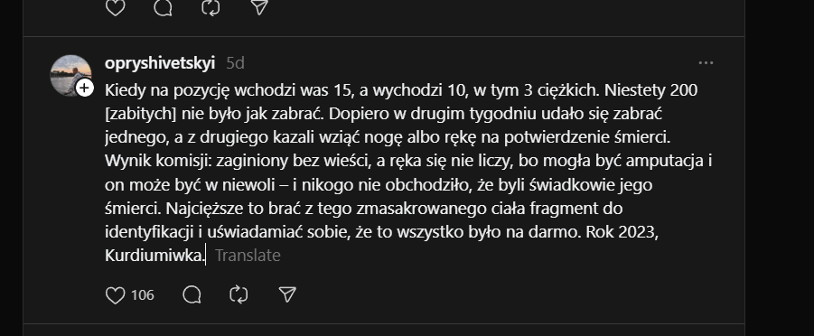Kiedy na pozycję wchodzi was 15, a wychodzi 10, w tym 3 ciężkich. Niestety 200 [zabitych] nie było jak zabrać. Dopiero w drugim tygodniu udało się zabrać jednego, a z drugiego kazali wziąć nogę albo rękę na potwierdzenie śmierci. Wynik komisji: zaginiony bez wieści, a ręka się nie liczy, bo mogła być amputacja i on może być w niewoli – i nikogo nie obchodziło, że byli świadkowie jego śmierci. Najcięższe to brać z tego zmasakrowanego ciała fragment do identyfikacji i uświadamiać sobie, że to wszystko było na darmo. Rok 2023, Kurdiumiwka.Image