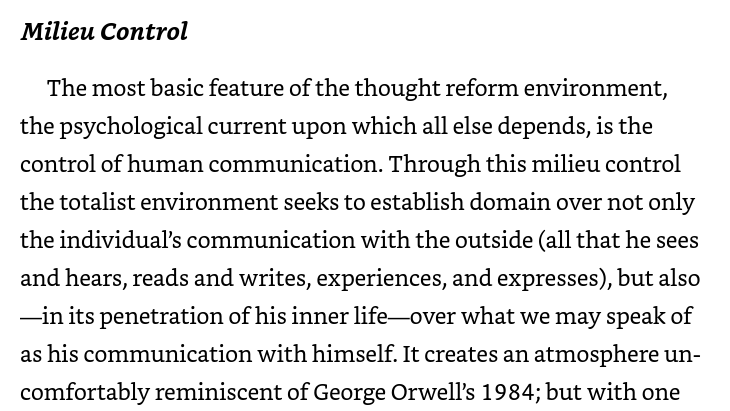 Milieu control involves controlling the environment and the communication within a group. Limiting access to outside information, preventing the group from developing ideas that may contrast with the planned ideology that is to control or is actively controlling the group. They also isolate the individuals of the group from those who think similarly to them, and place them in a group with the planned ideology. This isolation creates a new social reality that the member must adapt to and adopt, at least on a surface level, to maintain a social circle or risk ostracization.Image