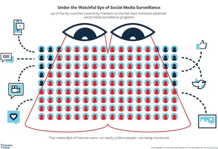 Through the use of a mass surveillance state, the regime can constantly monitor their population. This allows them to easily locate dissenters and have them silenced via removal of their ability to speak or through a visit from state authorities. This creates an environment of fear where speaking up can lead to you losing your voice or much worse. On top of this, creating a visible punishment of dissenters leads individuals to want to be quiet on the topics the state wishes to not be discussed. This does not necessarily come in the form of public trials but can come in the form of mass public ridicule, particularly through the use of media.Image