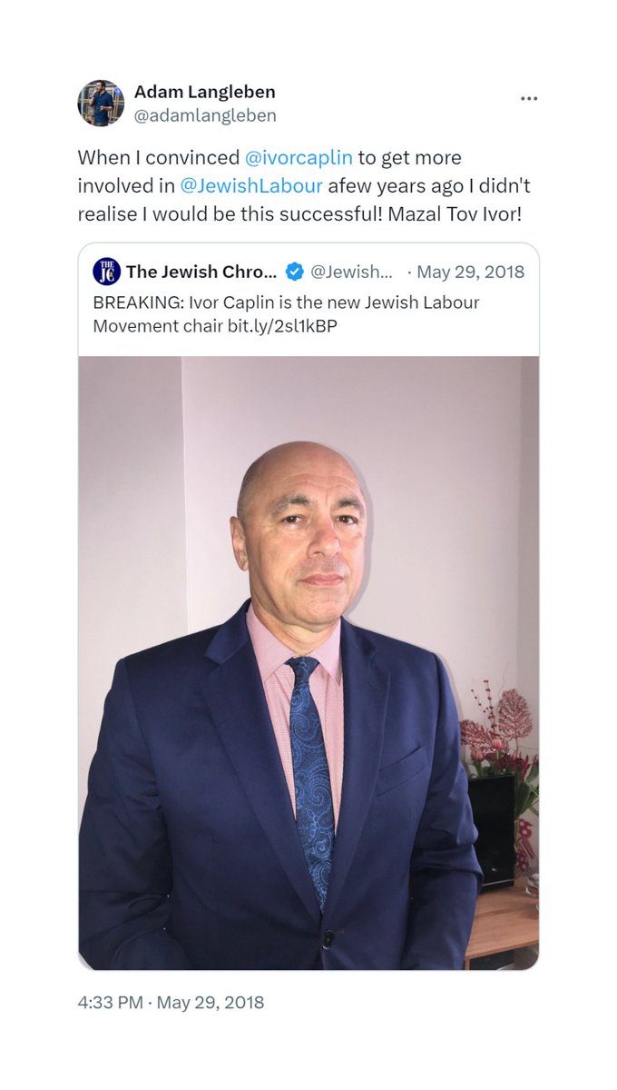 Over the weekend, McSweeney was defended by Adam Langleben, current head of Labour Party think tank “Progress” + former National Secretary of the Jewish Labour Movement.