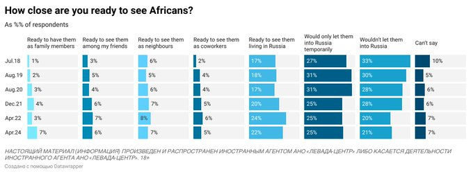 While apparently a lot of people in Africa still hold somewhat of a positive view of Russia, Russians do not at all reciprocate that feeling. Less then 1 in 10 Russians can even conceive having someone from Africa as a family member, neighbor, friend or coworker.