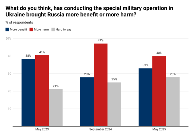 When prompted to judge on the benefits of war they started that left over a million of their own maimed or killed and an endless trail of war crimes in Ukraine, Russians seem rather equally split on it, with a third still yet to make up their mind about the whole affair.
