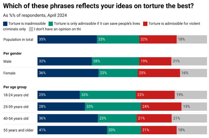While it's widely claimed that young Russians are different and a reason for hope given they aren't as indoctrinated by Kremlin's brainwashing machine, it turns out they're the least likely Russians to actually have an issue with or oppose the use of torture.