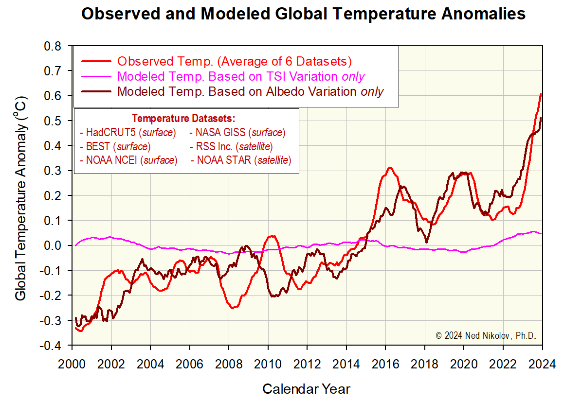 Using observed changes in Total Solar Irradiance (TSI) and Earth's albedo by CERES, an independent model derived from NASA planetary data & rules of calculus accurately predicted the WARMING of the past 24 years.