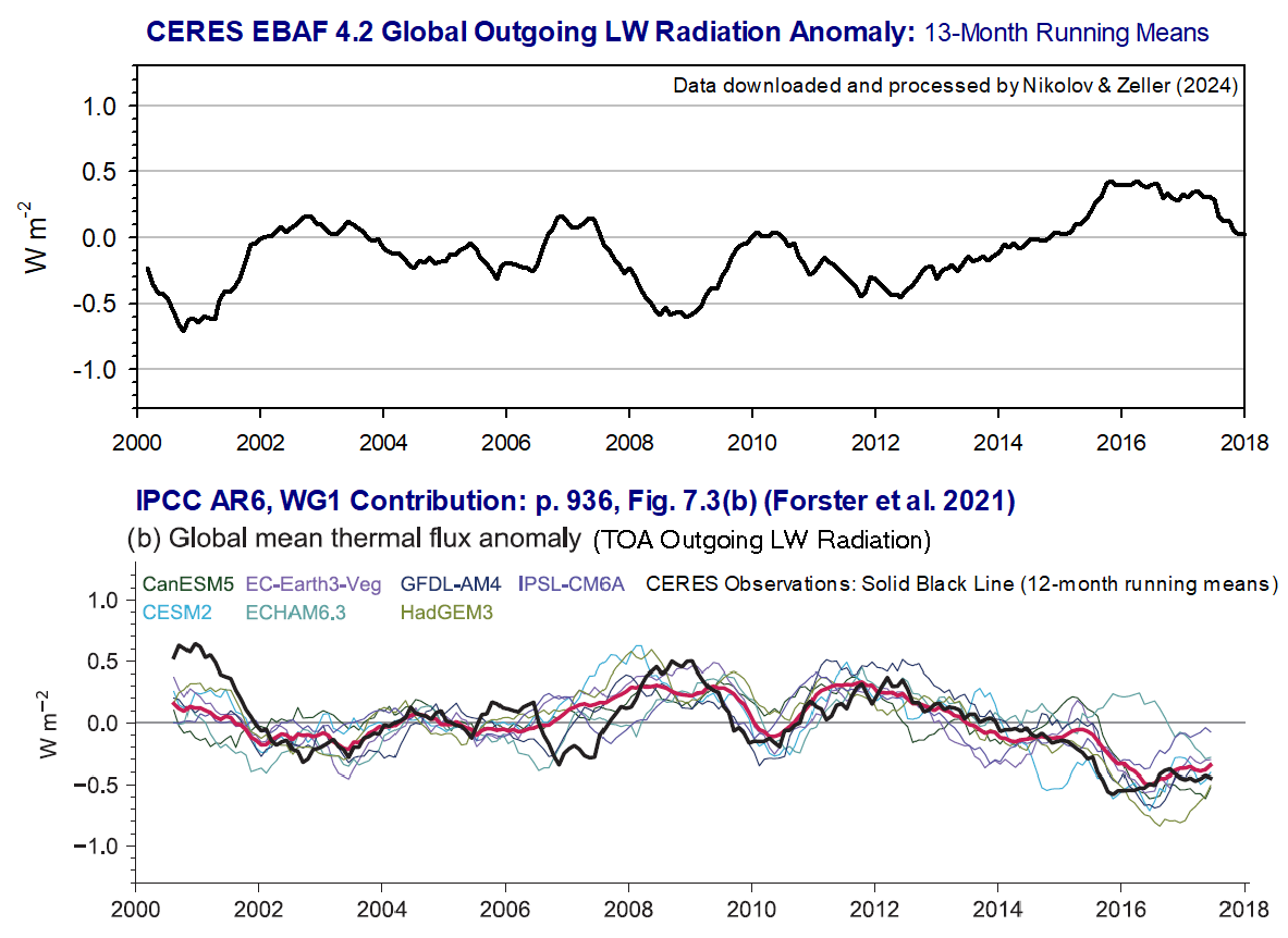 Misrepresenting the CERES data in this manner implies a deliberate fraud committed by the lead authors of Chapter 7, because the trends of reflected solar and outgoing LW fluxes have been inverted via multiplying the original CERES anomalies by -1.