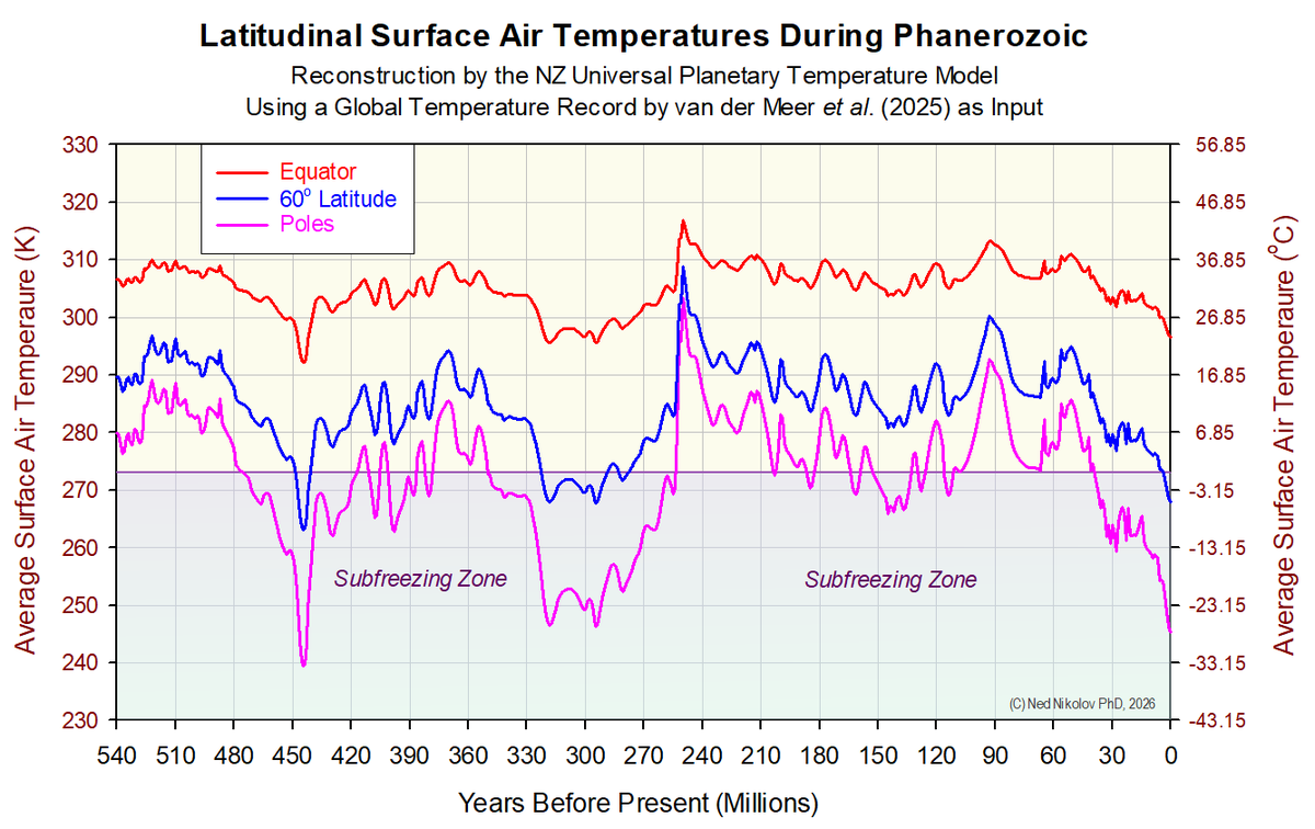 Our analysis showed that, throughout the last 540 My, the annual Polar temperatures were above freezing (0.1 °C) during 52.3% of the time, meaning that the Poles were ice-free during most of the Phanerozoic Eon. The attached graph illustrates the reconstructed dynamics of mean annual temperatures at the Equator, the Poles, and 60° latitude.