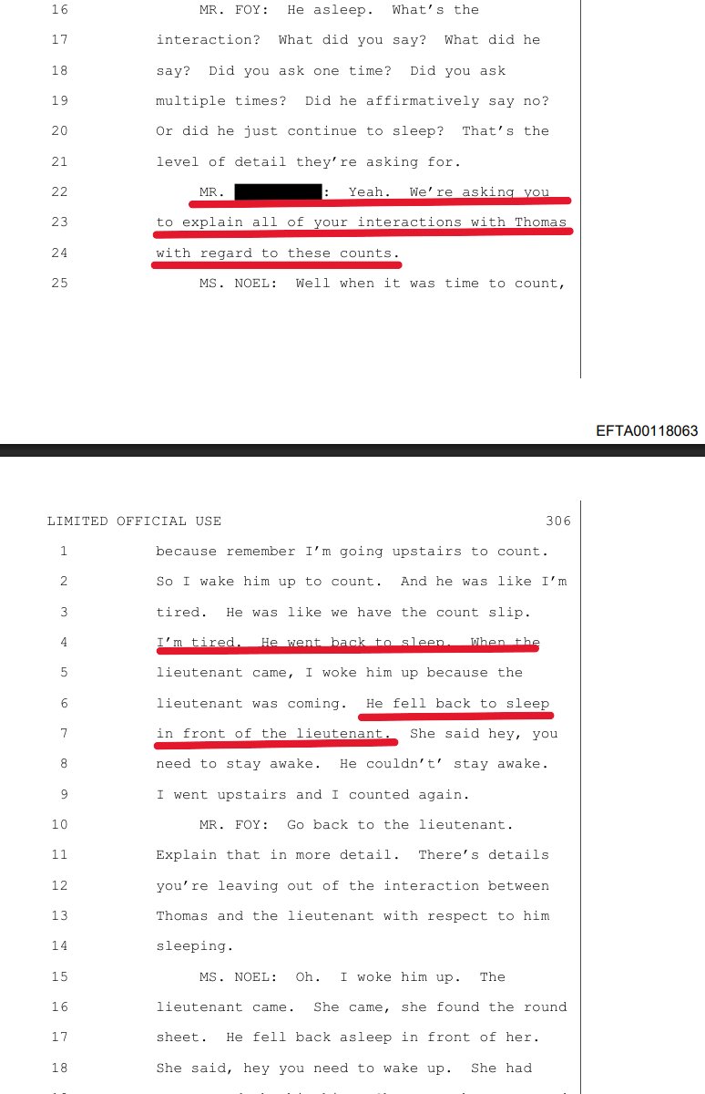 OIG did not ask them. And Thomas was asleep most of his shift, and Noel was either asleep or too lazy to move more than a few times, as this testimony makes clear. I am at the end of this thread, so I will fill in the conclusion here.