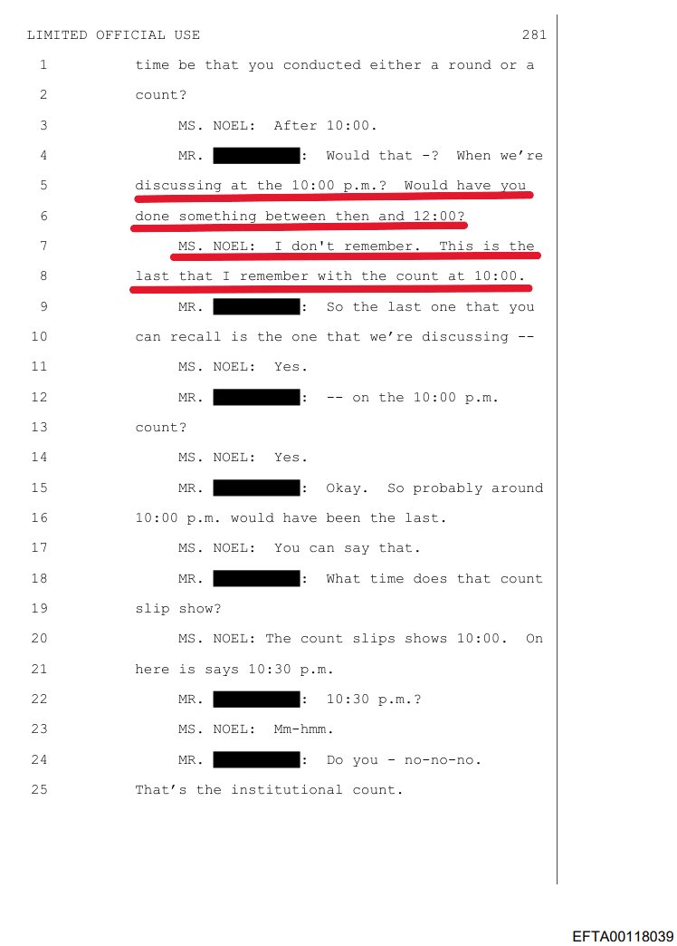 That was a MASSIVE lie. You could see the orange figure at 10:39 p.m. going up, easily. The OIG failed to even ask Noel or Thomas if it was her, and was in possession of her statement she doesn't deal with linens. Now the DOJ EFTA Team is trying to cover up Bonhomme's name in the files, to continue that fraud. Searching the index does not show his interview referenced in the CBS reporting.