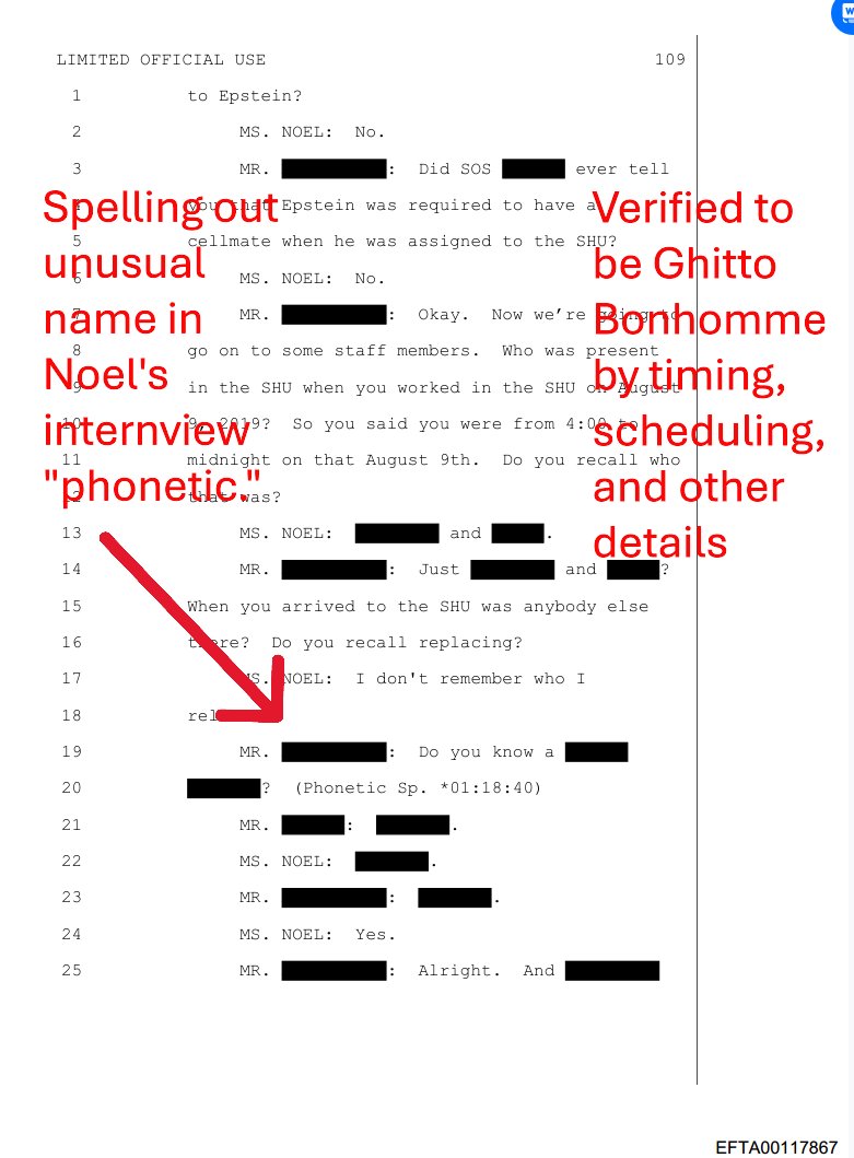 This is all over the place. Look at Noel's interview transcript. She's being asked about who was there during her 4 p.m. to midnight shift on the night Epstein died. Well, yet again, Ghitto's unique name saves the truth. See where it says "phonetic" spelling?"