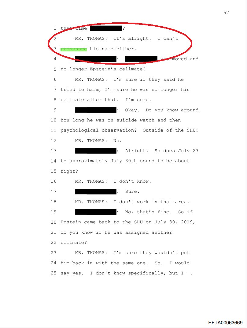the DOJ Epstein Files website that it couldn't have been a jail employee because that would violate the rules at MCC. Also, Noel claimed she doesn't take linens to inmates, that's the prior shift's responsibility. cbsnews.com/news/epstein-f…